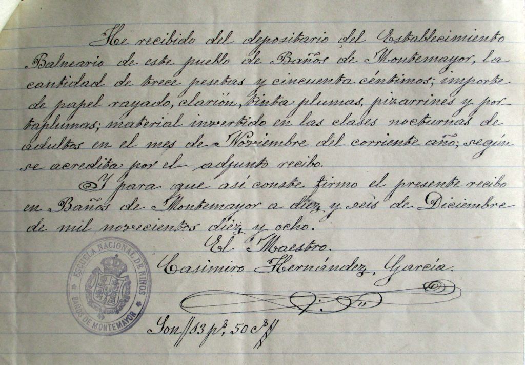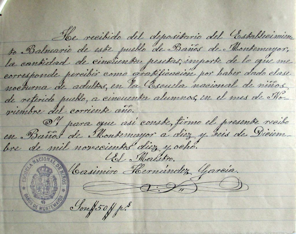 En 1918 quien da la clase nocturna a los adultos es Casimiro Hernández García, maestro con el sueldo de 50 pesetas, el mismo que tenía el sacerdote de santa María. En este año eran ya 50 los adultos que acudían a clase. Viendo la buena acogida que tuvo en ese año la escuela de adultos, la Junta del balneario dota a la misma con 13,50 pesetas para la compra del material para las clases: papel rayado, clarión, tinta, plumas, pizarrines y portaplumas.