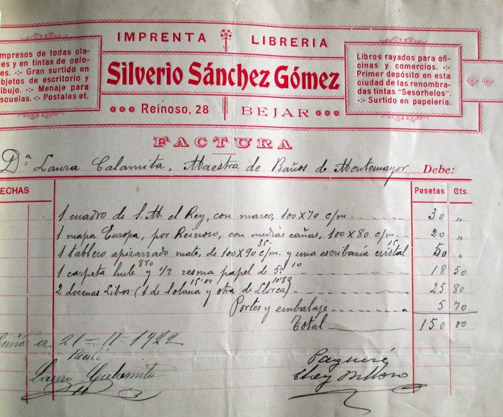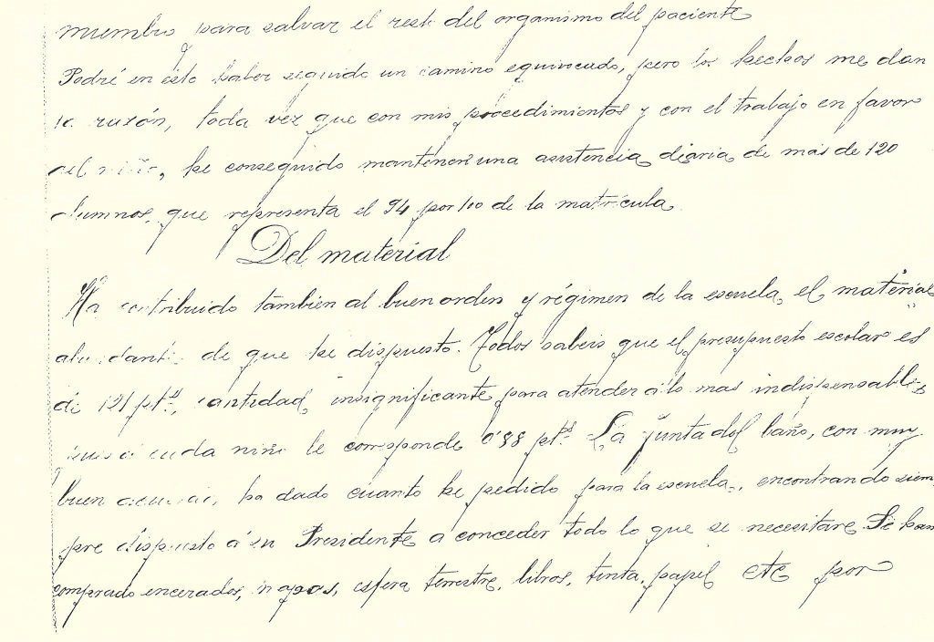 Con un presupuesto escolar público de 121 pesetas, cantidad insignificante para atender tantos niños, gracias a la Junta del balneario y a la asignación que le daba pudo tener el material adecuado. Se compraron encerados, mapas, esfera terrestre, libros, tinta, papel, etc., por valor de 1.358 pesetas, de las que 300 correspondieron a las niñas.
