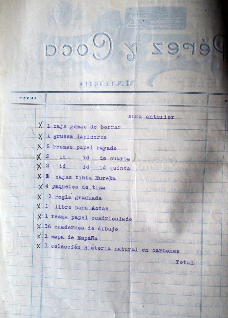 «Retrato de S. M. el Rey, crucifijo, mesa para el profesor, un sillón y dos sillas, armario-librería, 4 encerados, 20 mesas bipersonales, 4 banquillos, 4 docenas de tinteros de porcelana, 3 docenas de pizarras y una caja de pizarrines, mapa de España».