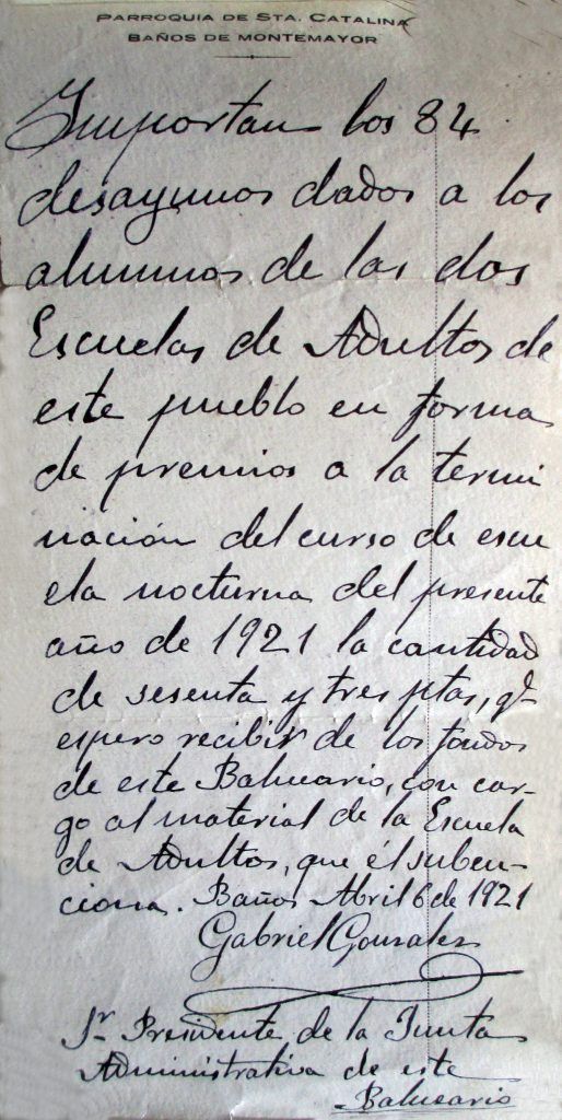 El 12 de diciembre de 1919 Gabriel González y Elías Serradilla, párrocos de ambas iglesias, reciben de la Junta del balneario 100 pesetas para la escuela de adultos. Pero esta escuela no tenía continuidad en el tiempo. En 1921 los dos sacerdotes se comprometieron de nuevo a formar clase de adultos, ya que la escuela oficial no era suficiente por el gran número de alumnos que acogía, por lo que se acordó por parte de la Junta del balneario, como patrocinadora de la misma, conceder una gratificación de 750 pesetas al encargado de la parroquia de santa María por cuya cantidad tendrían que dar clase a los adultos en unión del sacristán como auxiliar, de noviembre a marzo y subvencionando el material pedagógico que se necesitara. Todo ello según la Junta, «para beneficio de la cultura del pueblo». En 1922 hay problemas con las subvenciones que la Junta del balneario dona a los sacerdotes y sacristanes como auxiliares de la escuela de adultos, (la Junta no quería pagar al sacristán sueldo por dar clases) por lo que se rompen las negociaciones y se solicita que se haga cargo de la misma a Florencio Durán quien poseía título de maestro y para continuar con la labor necesaria se le paga cien pesetas mensuales y que no pasaran de cinco meses anuales el dar clases nocturnas a los adultos.
