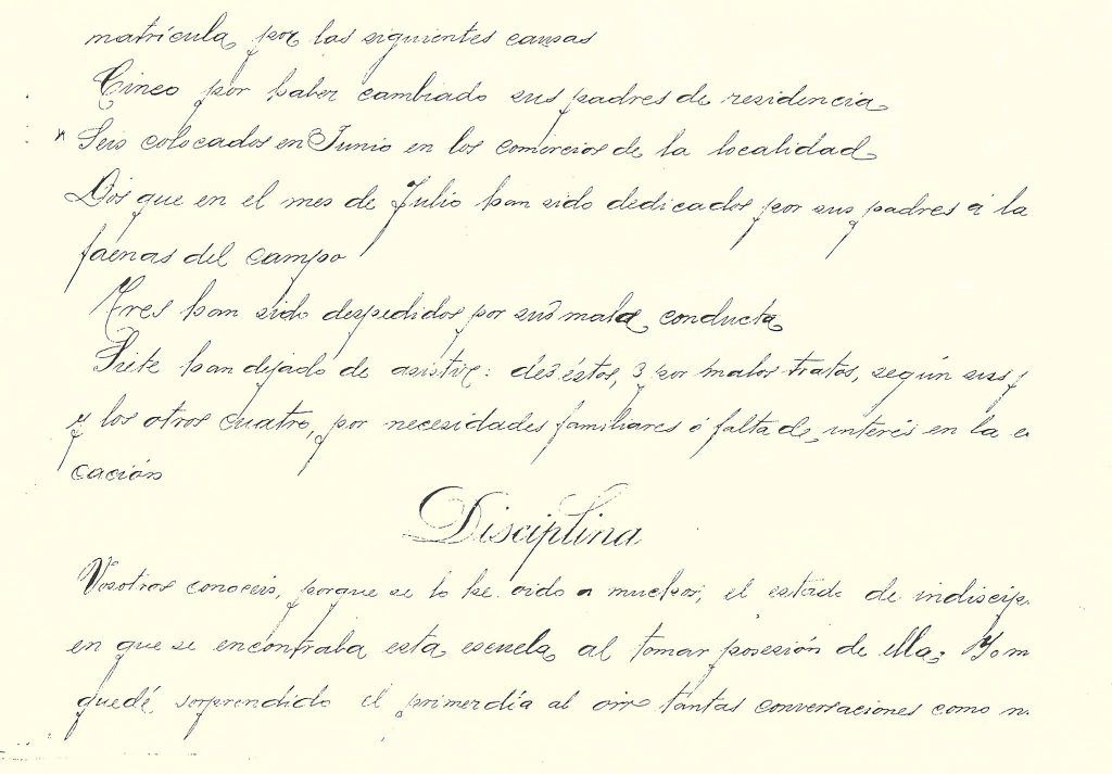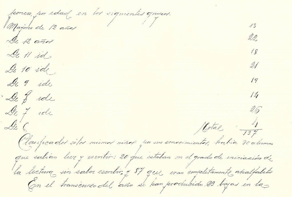 De los que empezaron el curso, sabían leer y escribir 30, en grado de iniciación de la lectura sin saber escribir 20 y completamente analfabetos 87. En el transcurso del año se produjeron 23 bajas en la matrícula por las siguientes causas: » cinco, por haber cambiado sus padres de residencia, seis colocados en junio en los comercios de la localidad, dos que en el mes de julio han sido dedicados por sus padres a las faenas del campo, tres han sido despedidos por su mala conducta, siete han dejado de asistir, de éstos tres por malos tratos, según sus padres y los otros cuatro por necesidades familiares o falta de interés en la educación.»