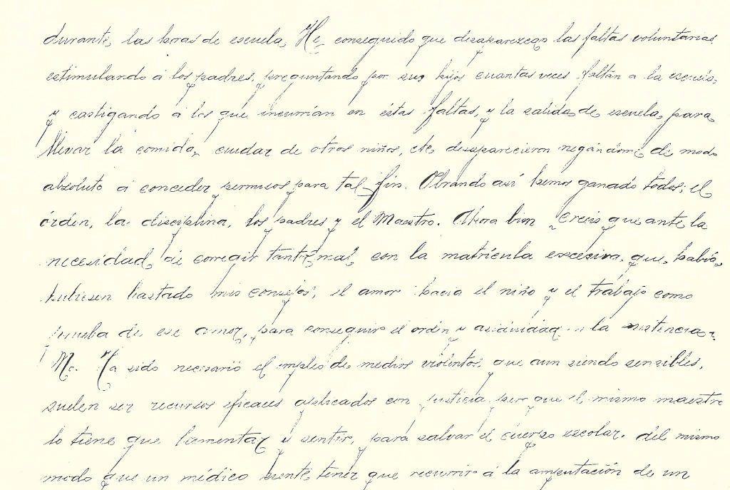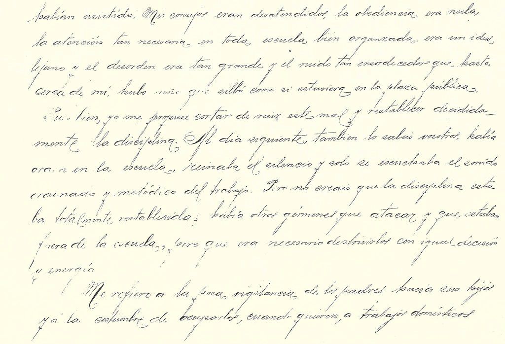 Para conseguir dicho orden y disciplina según sus propias palabras “tuve que hacer empleo de medios violentos, que aun siendo sensibles suelen ser recursos eficaces aplicados con justicia pero que el mismo maestro lo tiene que lamentar y sentir para salvar el cuerpo escolar”. Se reafirma en sus memorias que pudo haberse equivocado con ese camino, pero los hechos, según él, le daban la razón toda vez que con sus procedimientos y con el trabajo a favor del niño, consiguió mantener una asistencia diaria de más de 120 alumnos que representaba el 94 % de la matrícula.