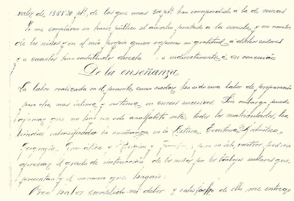 Comenta, por último, que acabado el curso no había ningún analfabeto, habiéndose intensificado la enseñanza en la Lectura, Escritura, Aritmética, Geografía, Gramática y Religión.