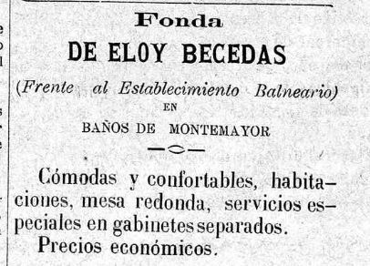 La primera fonda u hotel que se construye en Baños de Montemayor es en 1878, llamado hotel “Eloy”, fundado por Eloy Becedas Miña (1853-1909) y su mujer Basilisa Regidor Pérez (1856-1938).